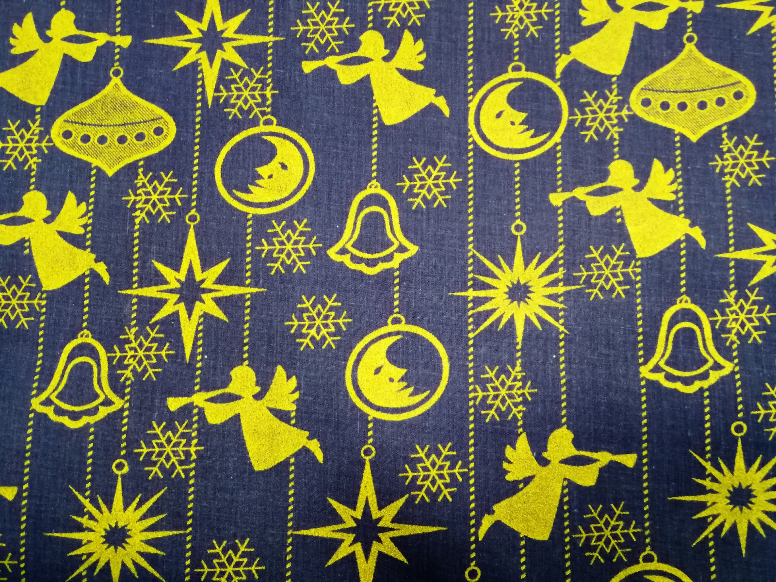 Vékonyabb vászon anyag karácsonyi mintával. Sötétkék alapon arany mintás: angyalka, karácsonyfadísz, csengő.