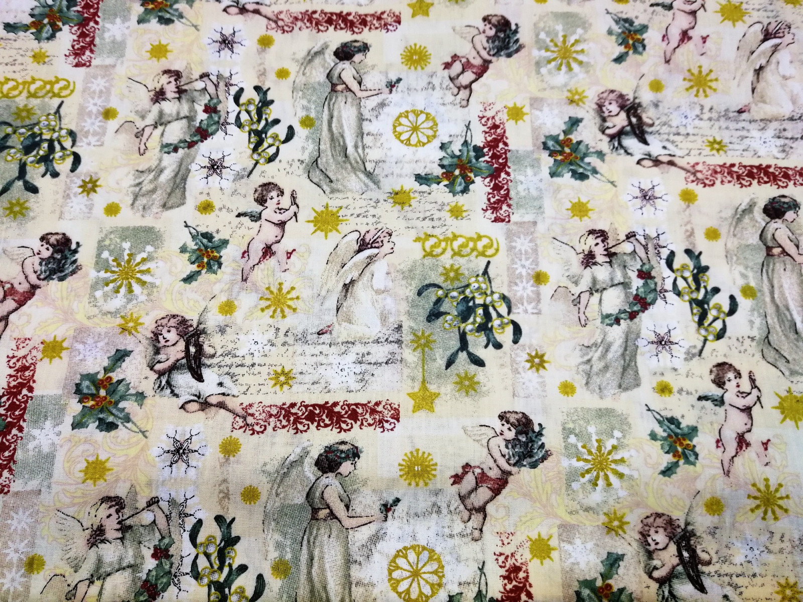 Vékonyabb pamutvászon anyag karácsonyi mintával. Nyers alapon angyalka mintás.