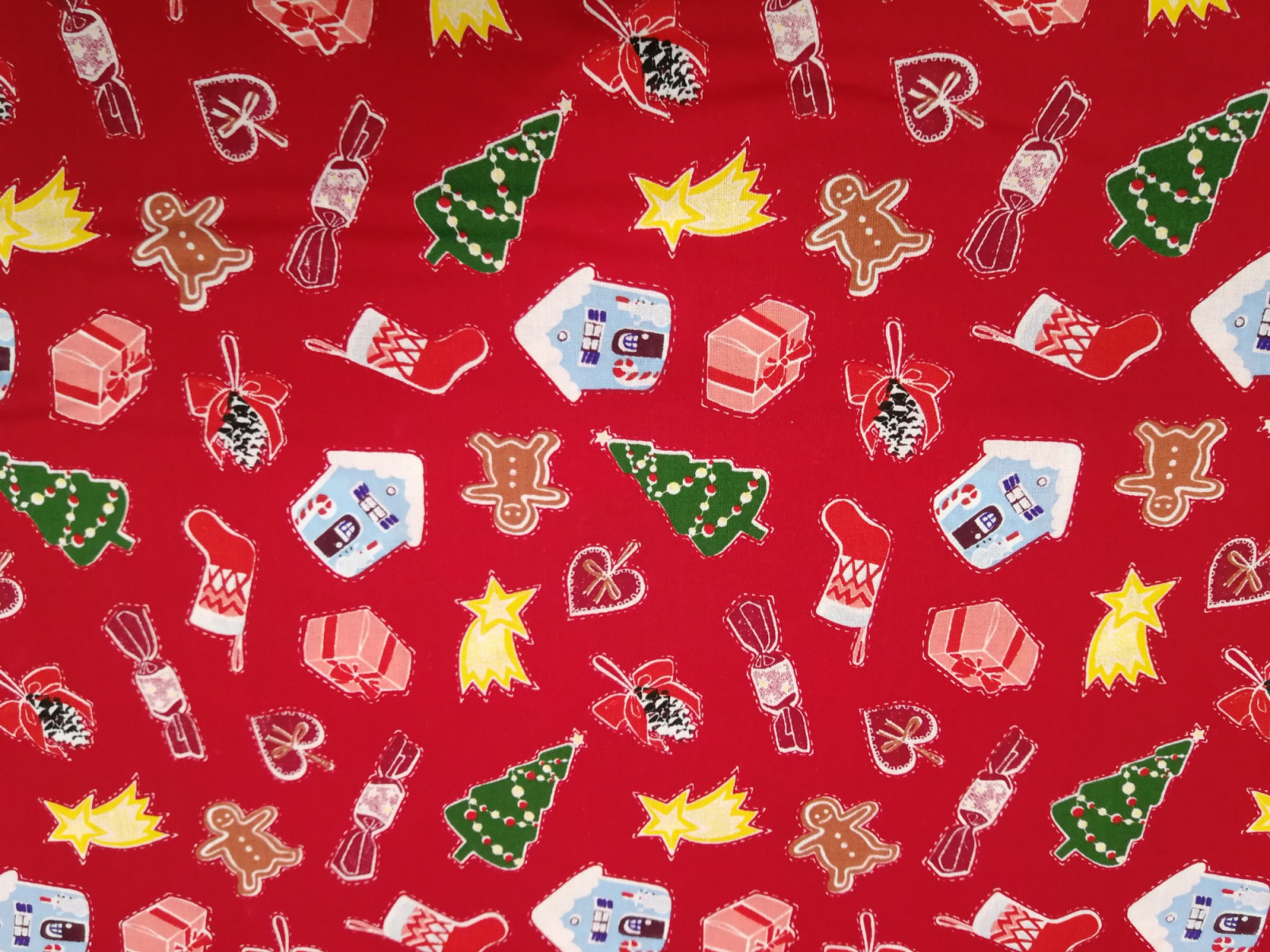 Vékonyabb pamutvászon anyag karácsonyi mintával. Piros alapon aprómintás: fenyő, szaloncukor, mézeskalács, csizma, stb.