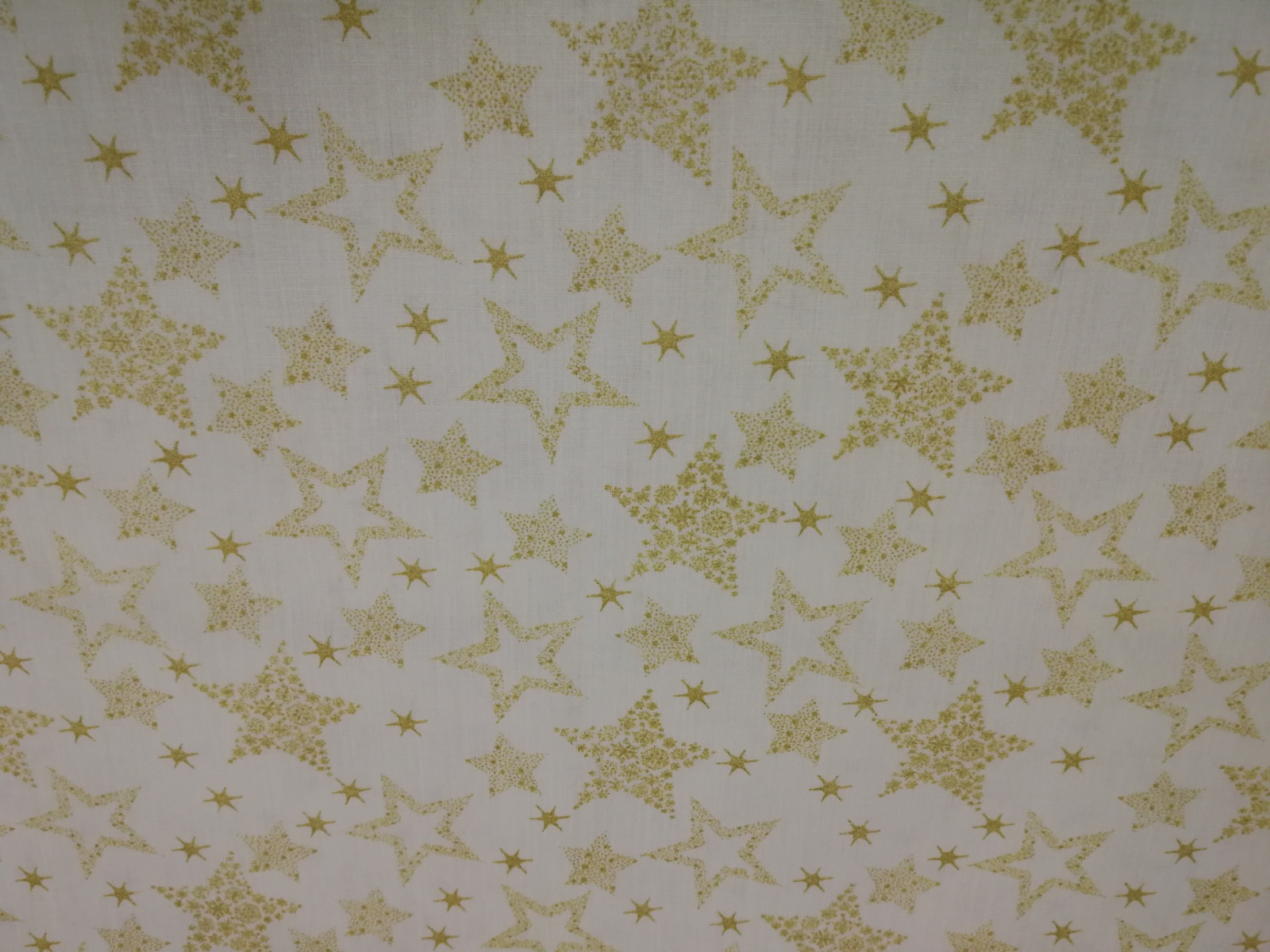 Vékonyabb pamutvászon anyag karácsonyi mintával. Nyers alapon arany mintás: csillagok.