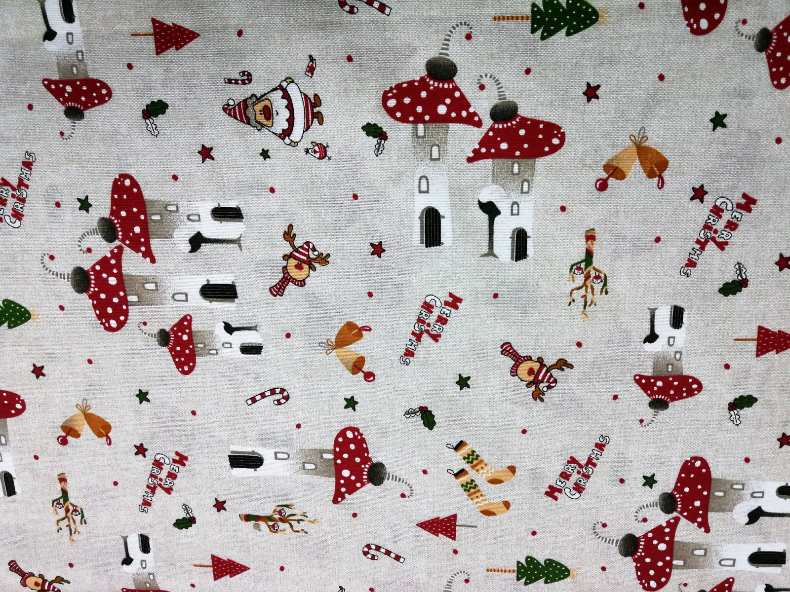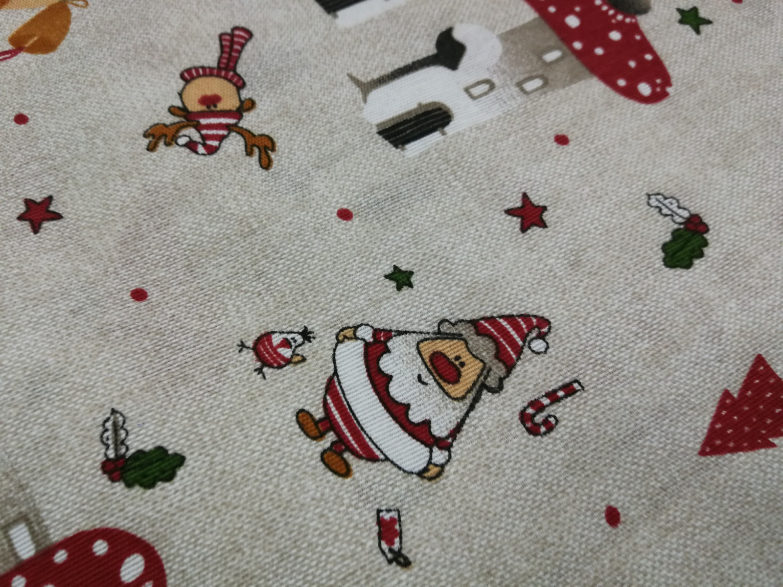 Vastagabb vászon anyag karácsonyi mintával. Nyers alapon mintás: házikók, mikulás, rénszarvas, fenyő.
