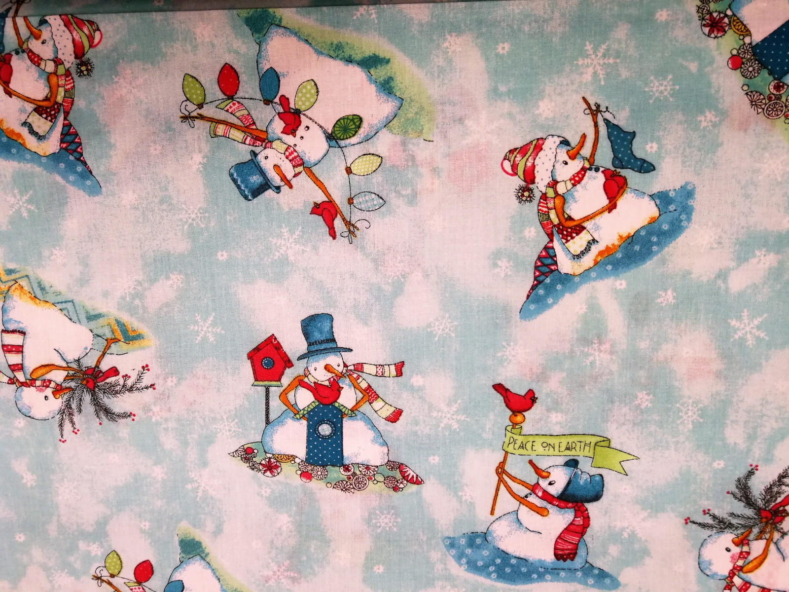Vékonyabb pamutvászon anyag karácsonyi mintával. Türkiz-fehér alapon hóember mintás.