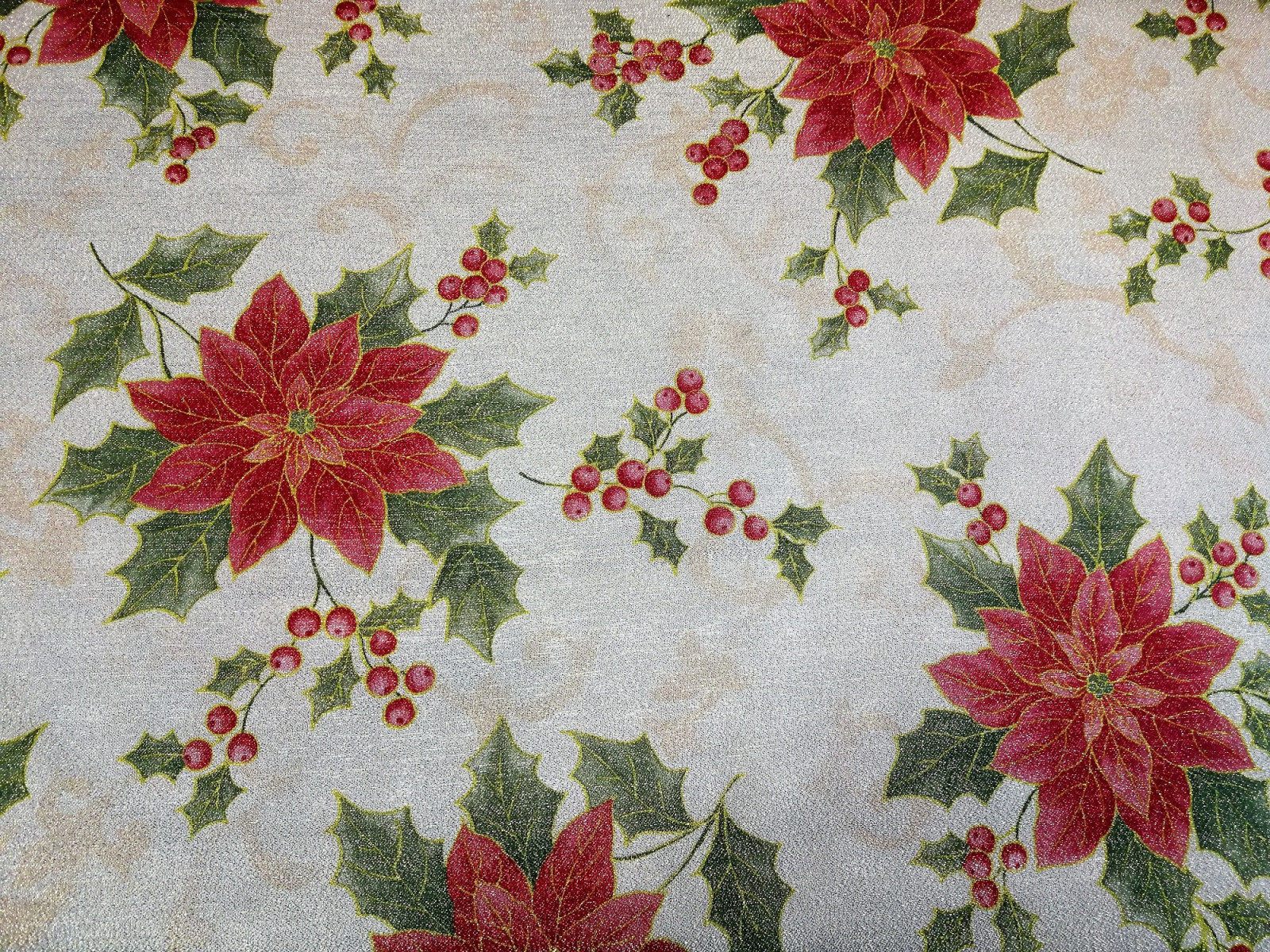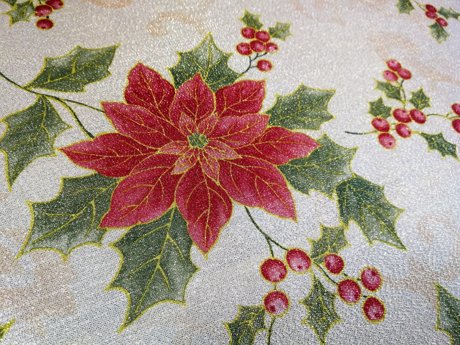 Vastagabb vászon anyag karácsonyi mintával. Világos nyers-arany alapon piros mikulásvirágok és bogyók.