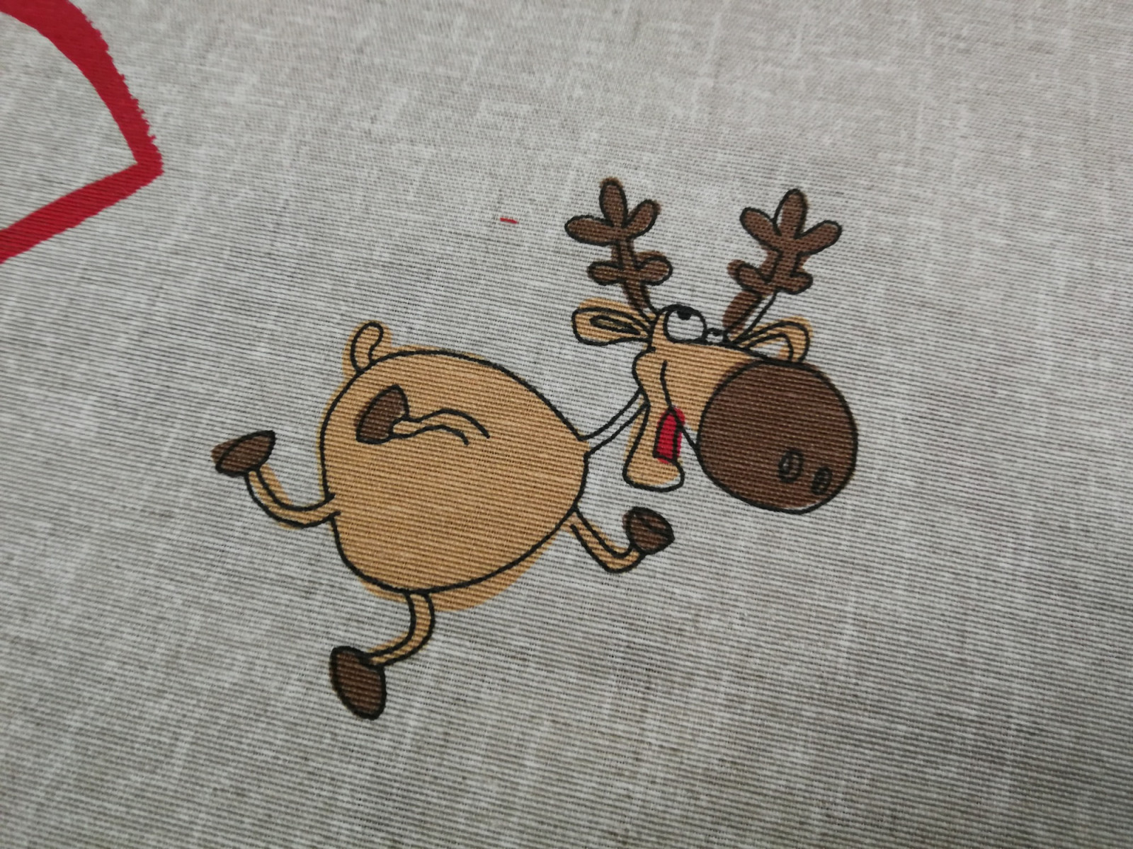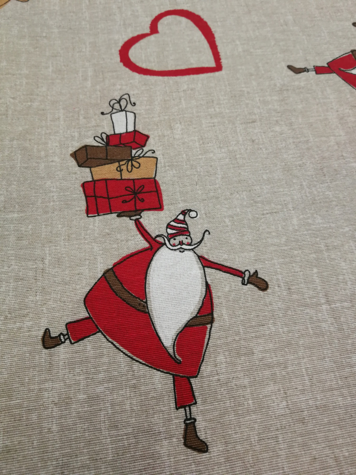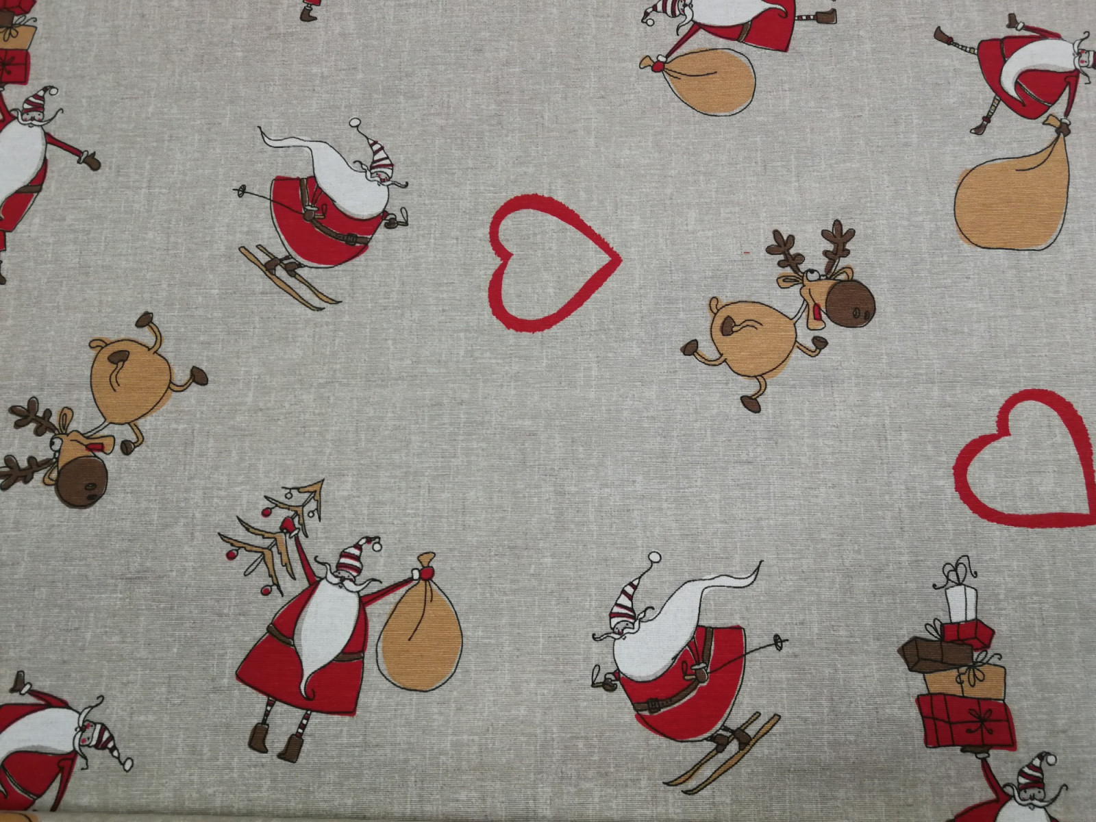 Vastagabb vászon anyag karácsonyi mintával. Nyers alapon mintás: vicces Mikulás és rénszarvasok.